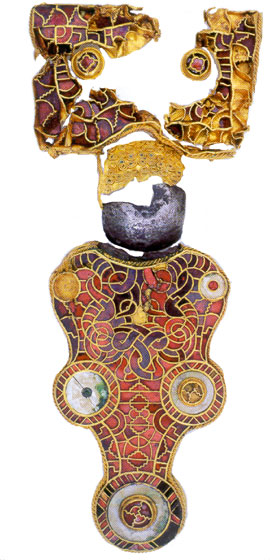 Het kostbaarste voorwerp dat ooit in Friesland is gevonden, is deze met goud en halfedelsteen versierde mantelspeld uit Wijnaldum. Deze speld is 17 centimeter lang en moet het eigendom zijn geweest van een heel belangrijk persoon, misschien wel een koning. (Foto: Fries Museum)