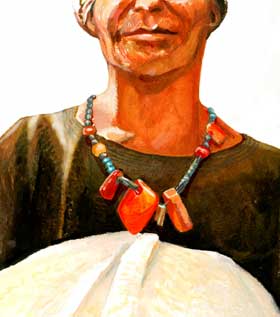 In het veen bij Exloo in Drenthe is een bijzonder halssnoer gevonden met kralen van barnsteen, tin en faience, een soort glas. Het snoer is waarschijnlijk als offer in het veen begraven. (Tekening: Kelvin Wilson)