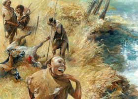 Een groepje jagers (Homo erectus) heeft twee wilde paarden in het nauw gedreven en gedood. (Tekening: Kelvin Wilson)