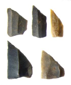 Kleine vuurstenen pijlpunten uit de Midden-Steentijd, bedoeld om vogels en kleine zoogdieren mee te schieten. Archeologen noemen ze microlithen (uit het Grieks: mikros = klein, lithos = steen). (Foto: J.H. Cock)