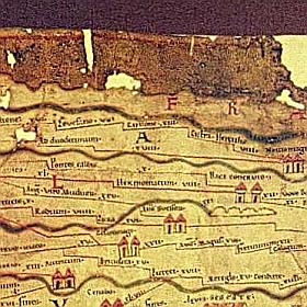 Een stuk van de 'Kaart van Peutinger', waarop ons land is afgebeeld. De dikke kronkellijn bovenaan is de Rijn. Op de kaart zijn gebouwtjes getekend waar grote en kleinere plaatsen liggen. (Foto: Simon Wynia)
